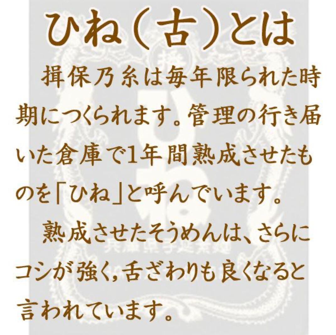 「ひね」は、揖保乃糸の中の特級品を製造から約1年間熟成させた手延べそうめんです。特に味・香り・コシの深みに優れた、通好みの逸品です。