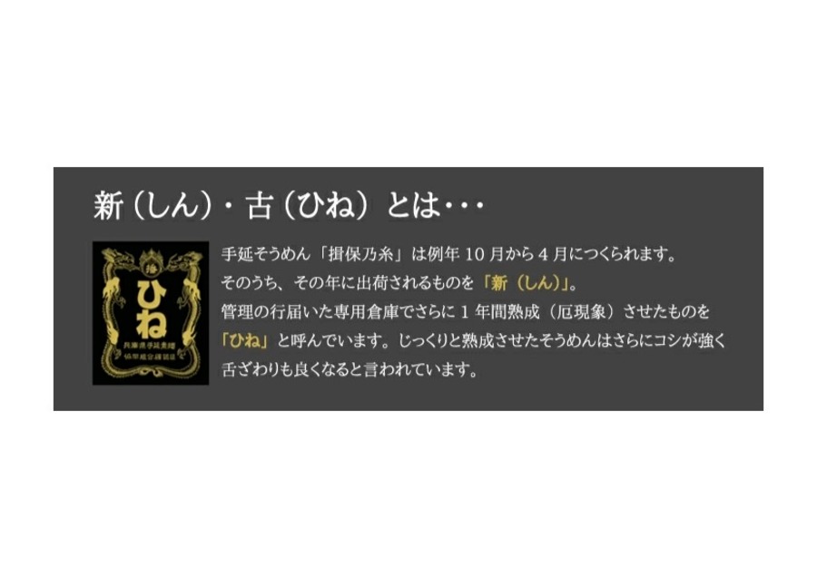 「ひね」は、揖保乃糸の中の特級品を製造から約1年間熟成させた手延べそうめんです。特に味・香り・コシの深みに優れた、通好みの逸品です。